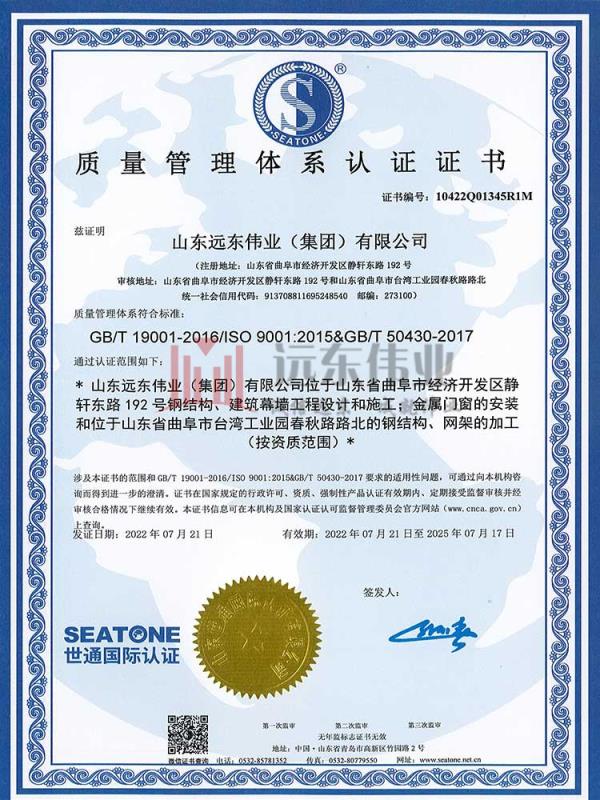 質(zhì)量管理體系認(rèn)證證書 2023-09-13 09:26:35 上一條:環(huán)境管理體系認(rèn)證證書 下一條: 企業(yè)信用等級證書 相關(guān)資訊 夯實基礎(chǔ)·砥礪奮進(jìn) | 重慶龍... 正在施工的和新承接的項目情... 近年完成的類似項目情況表... 關(guān)于加強項目部農(nóng)民工工資支... 熱門推薦 黃海明珠中心 濟寧運河城 開發(fā)區(qū)萬達(dá)廣場 中國重汽濟寧商用車有限公司