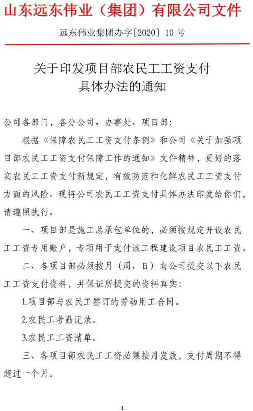 關(guān)于印發(fā)項(xiàng)目部農(nóng)民工工資支付具體辦法的通知 2023-09-12 17:26:25 上一頁(yè):關(guān)于進(jìn)一步加強(qiáng)安全生產(chǎn)工作的通知 下一頁(yè): 喜訊|山東遠(yuǎn)東偉業(yè)集團(tuán)全力打造北京副中心站綜合交通樞紐工程 相關(guān)資訊 夯實(shí)基礎(chǔ)·砥礪奮進(jìn) | 重慶龍... 正在施工的和新承接的項(xiàng)目情... 近年完成的類(lèi)似項(xiàng)目情況表... 關(guān)于加強(qiáng)項(xiàng)目部農(nóng)民工工資支... 熱門(mén)推薦 黃海明珠中心 濟(jì)寧運(yùn)河城 開(kāi)發(fā)區(qū)萬(wàn)達(dá)廣場(chǎng) 中國(guó)重汽濟(jì)寧商用車(chē)有限公司